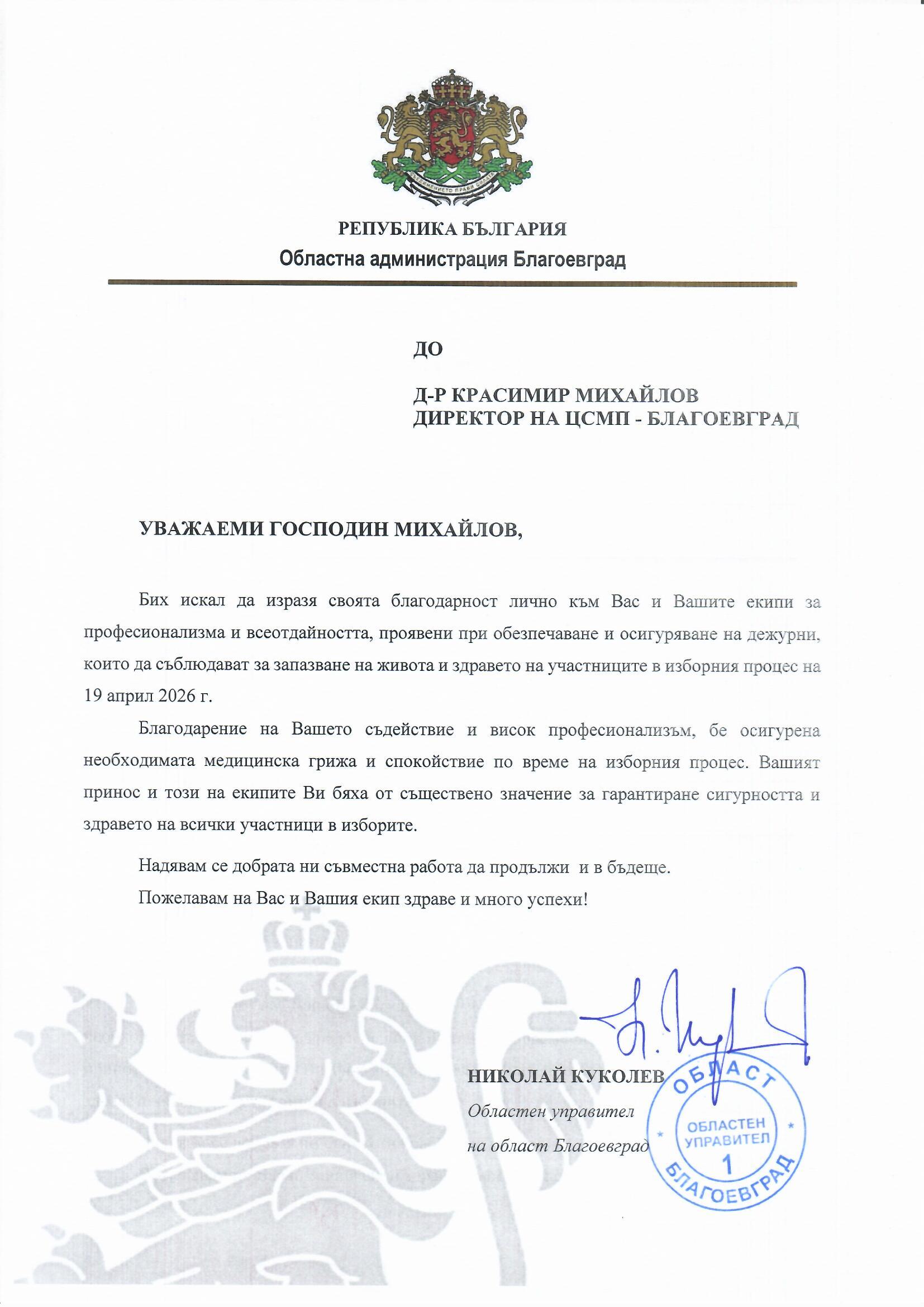 Благодарствено писмо от Николай Куколев, Областен управител на област Благоевград